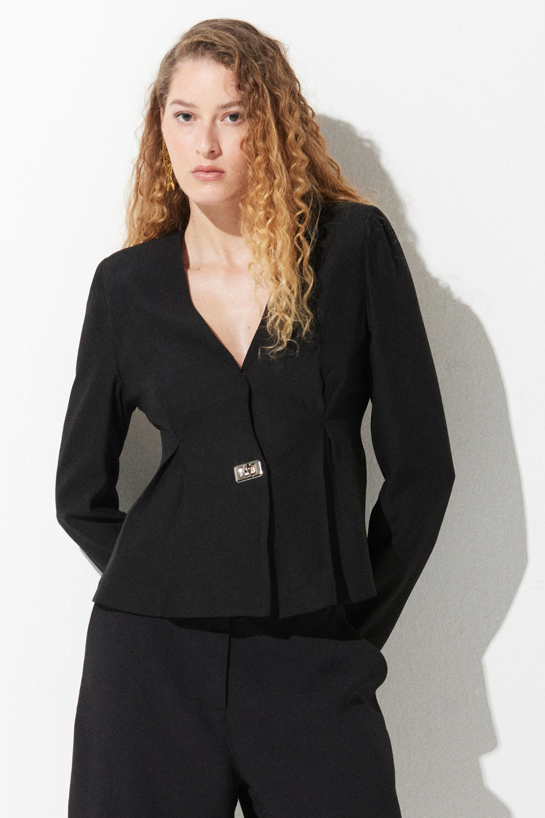 Blazer manga longa de crepe Patou. Cintura marcada com leve peplum abaixo do umbigo marcado por 2 nesgas frontais. Parte de trás lisa. Fechamento frontal com aviamento prateado e botão invisível na parte do decote. Mangas retas de blazer. Decote careca sem gola.