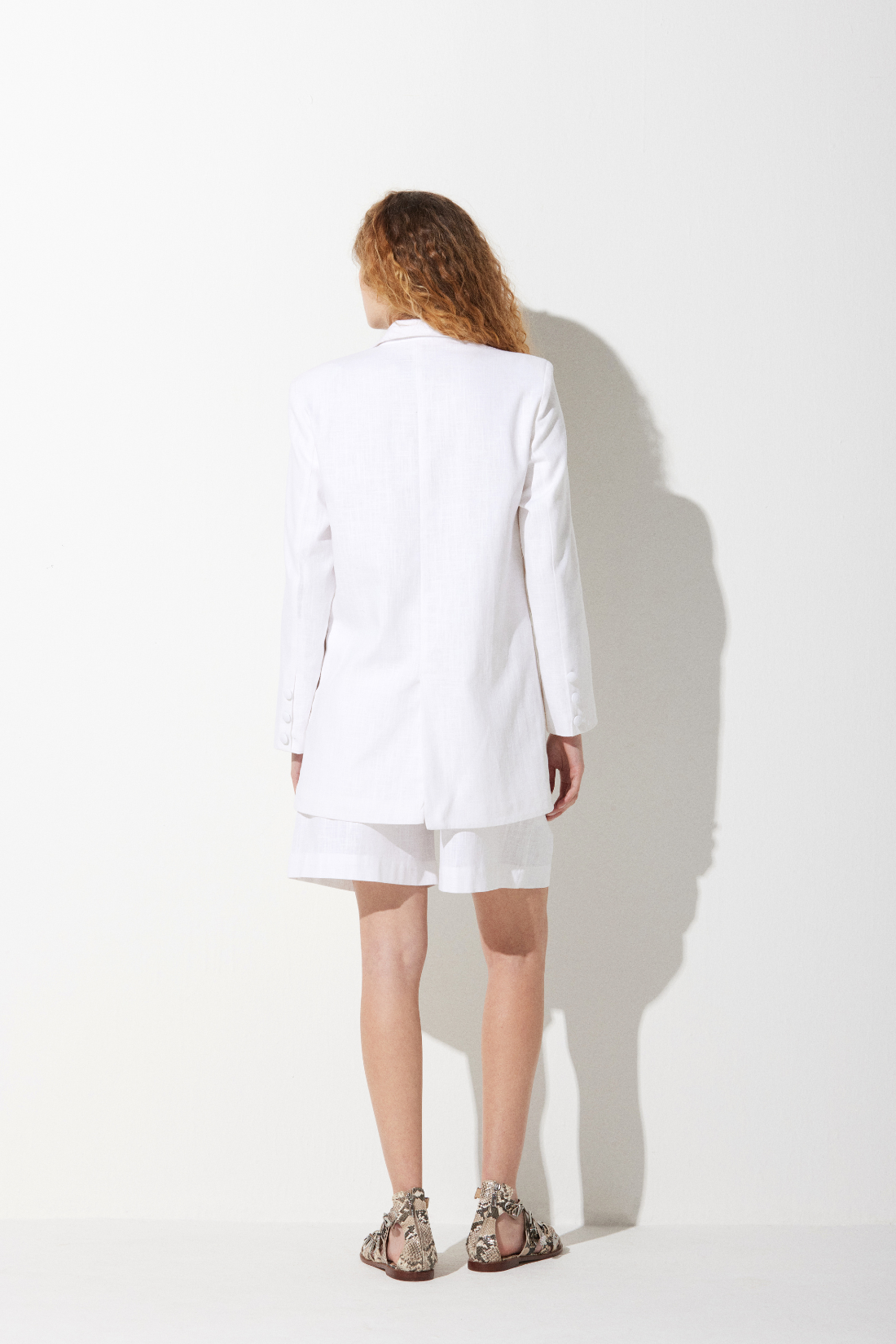 Blazer alongado de linho 100% na cor off white, com aplicação em crochet manual no busto. Mangas longas e justinhas, corpo reto e alongado. Gola de blazer e botões forrados. Fenda na barra atrás. Com forro.