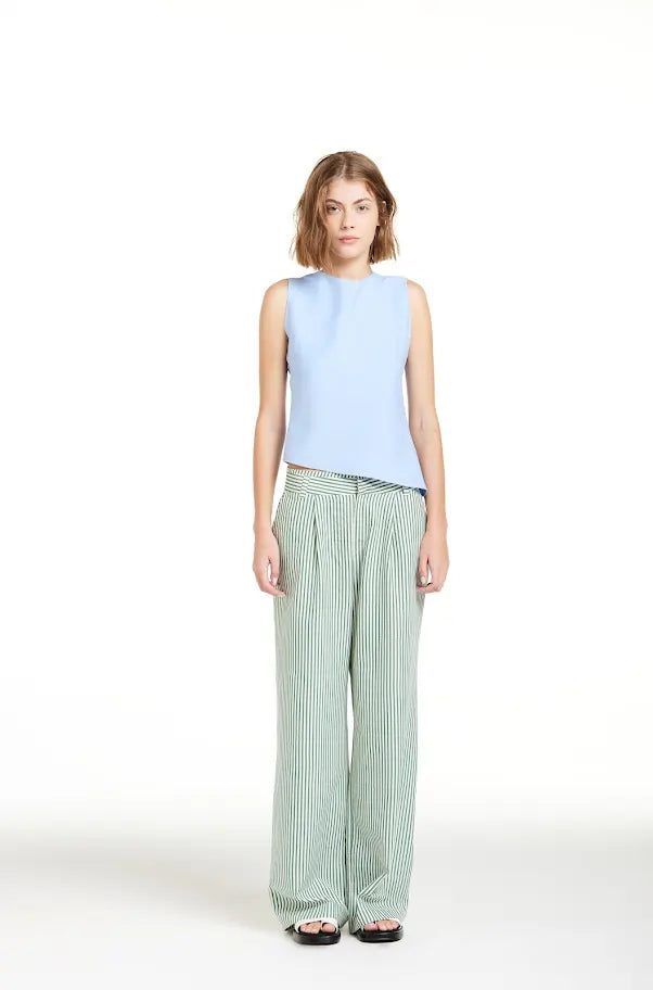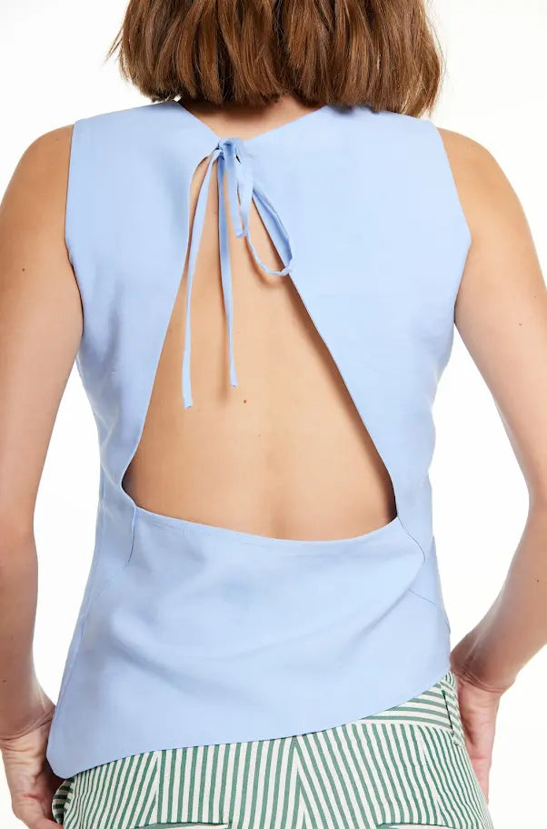 Blusa sem manga de viscose azul, barra assimétrica, abertura irregular de triângulo nas costas. Com revel, zíper na lateral, fechamento de tiras atrás do pescoço.