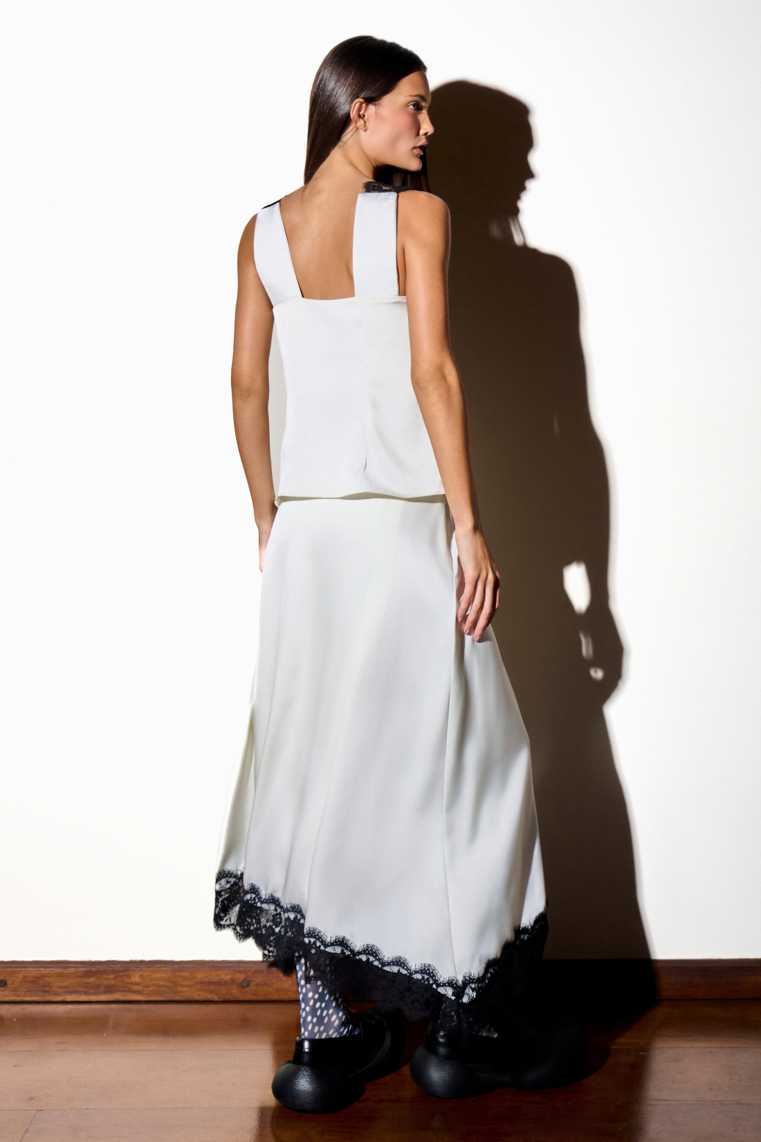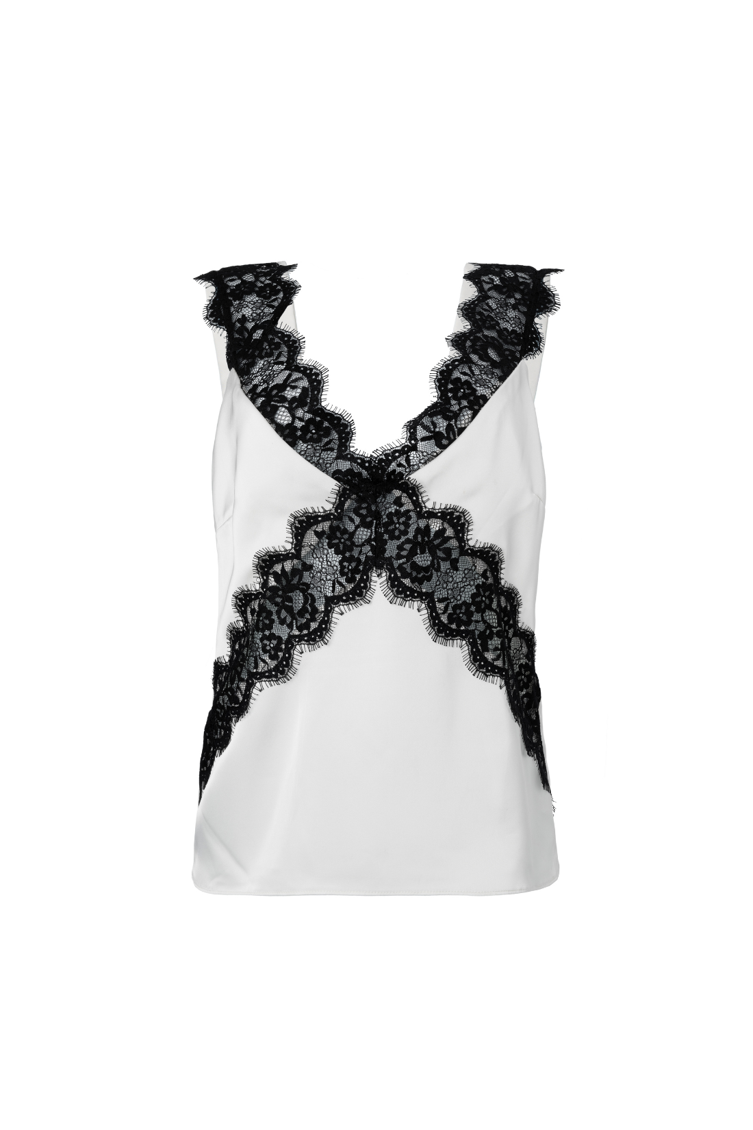 Blusa de cetim branca com intervenção de renda preta chantilly. Alças largas. Modelagem acinturada.