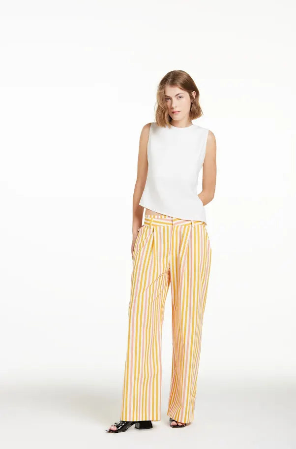 Calça listrada de tons terrosos relax fit de algodão, pernas largas e retas, bolso frontal, fechamento com gancho e zíper. Cós com as listras no sentido contrário da perna. Prega frontal.