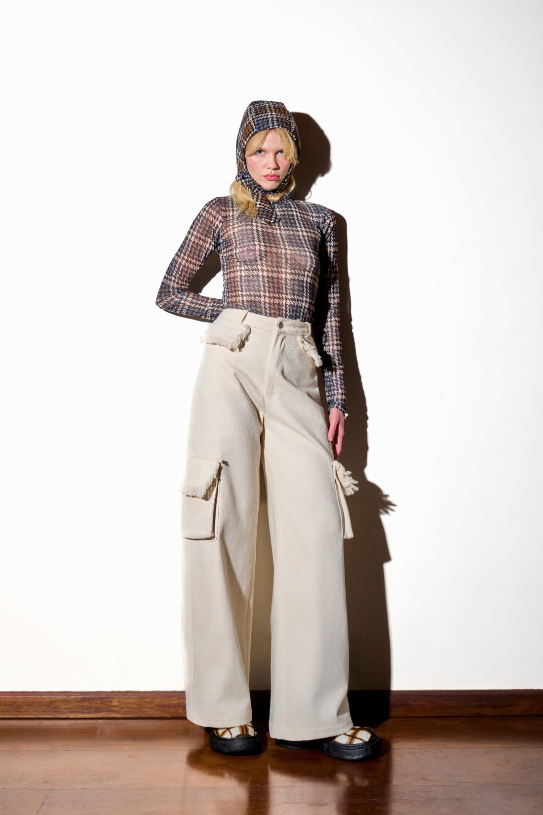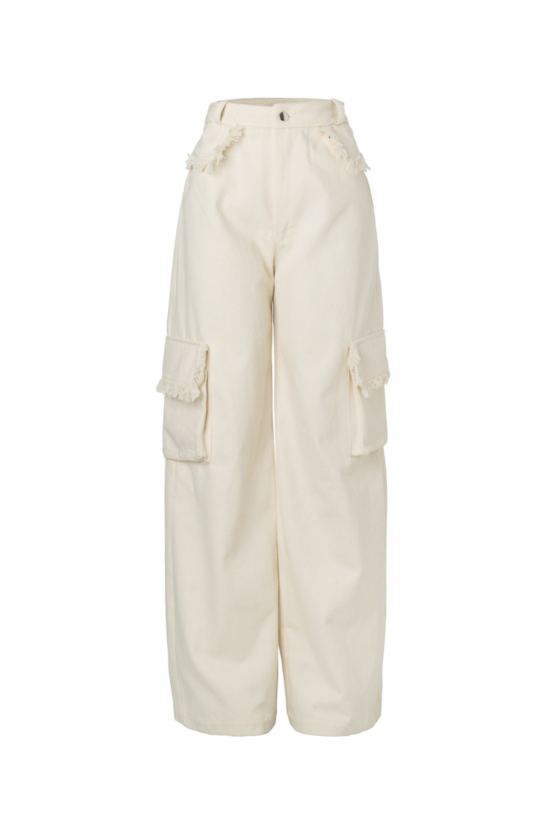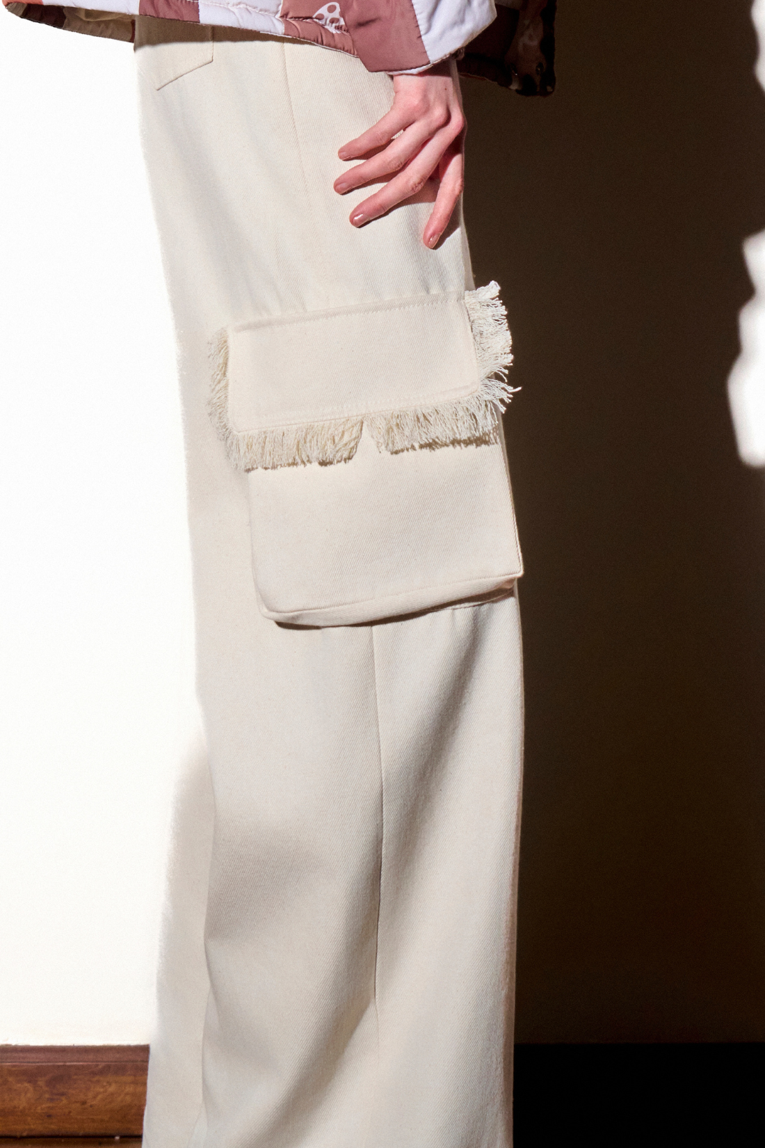 Calça em sarja cru, modelagem ampla com recortes decorativos na lateral. Cós com botão de metal e zíper. Bolsos laterais na perna. Etiqueta de couro caramelo com logomarca.