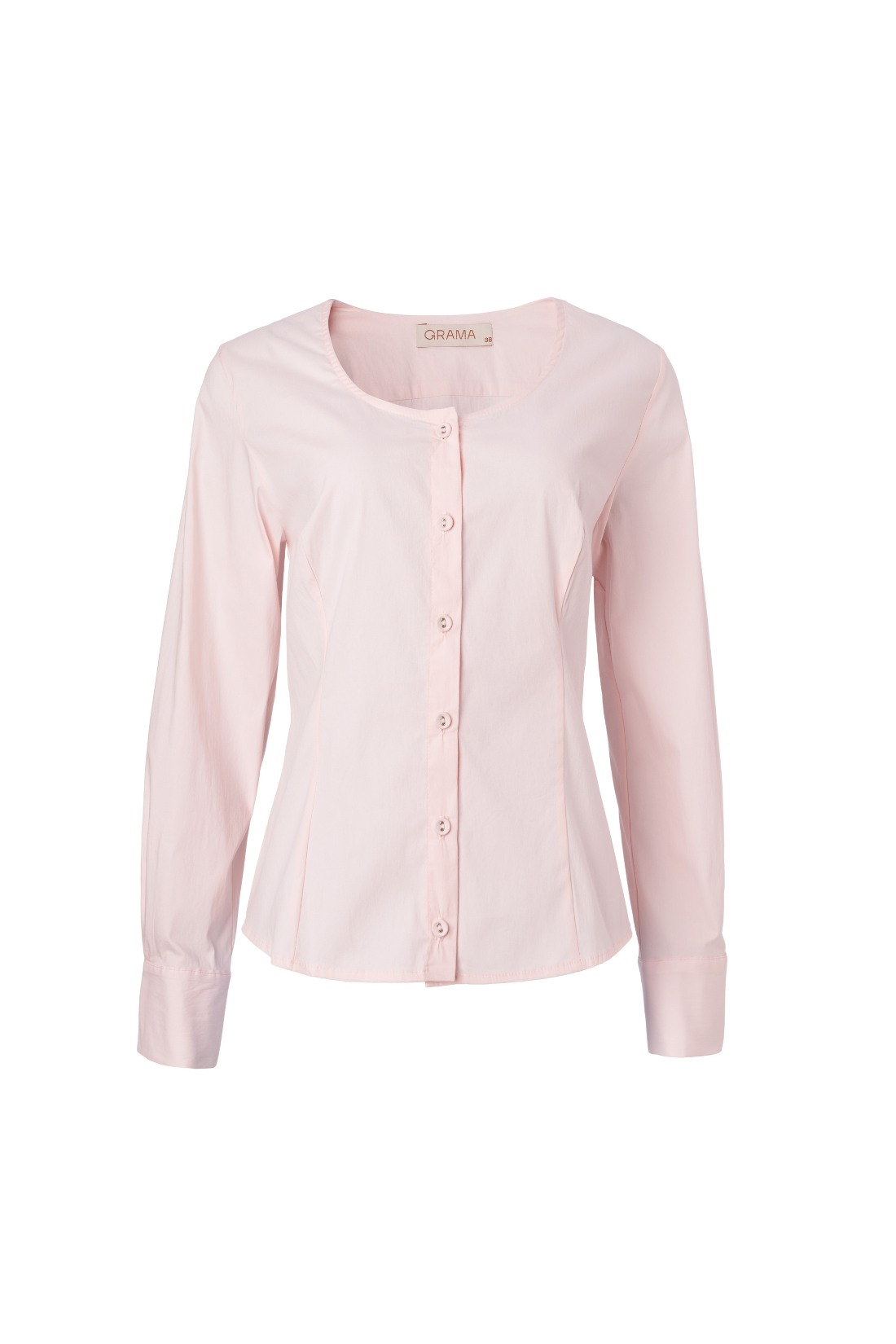 Camisa de algodão com elastano. Gola "careca" em forma circular, mangas longas com punho e botão. Fechamento frontal com botões. Modelagem justinha e acinturada.