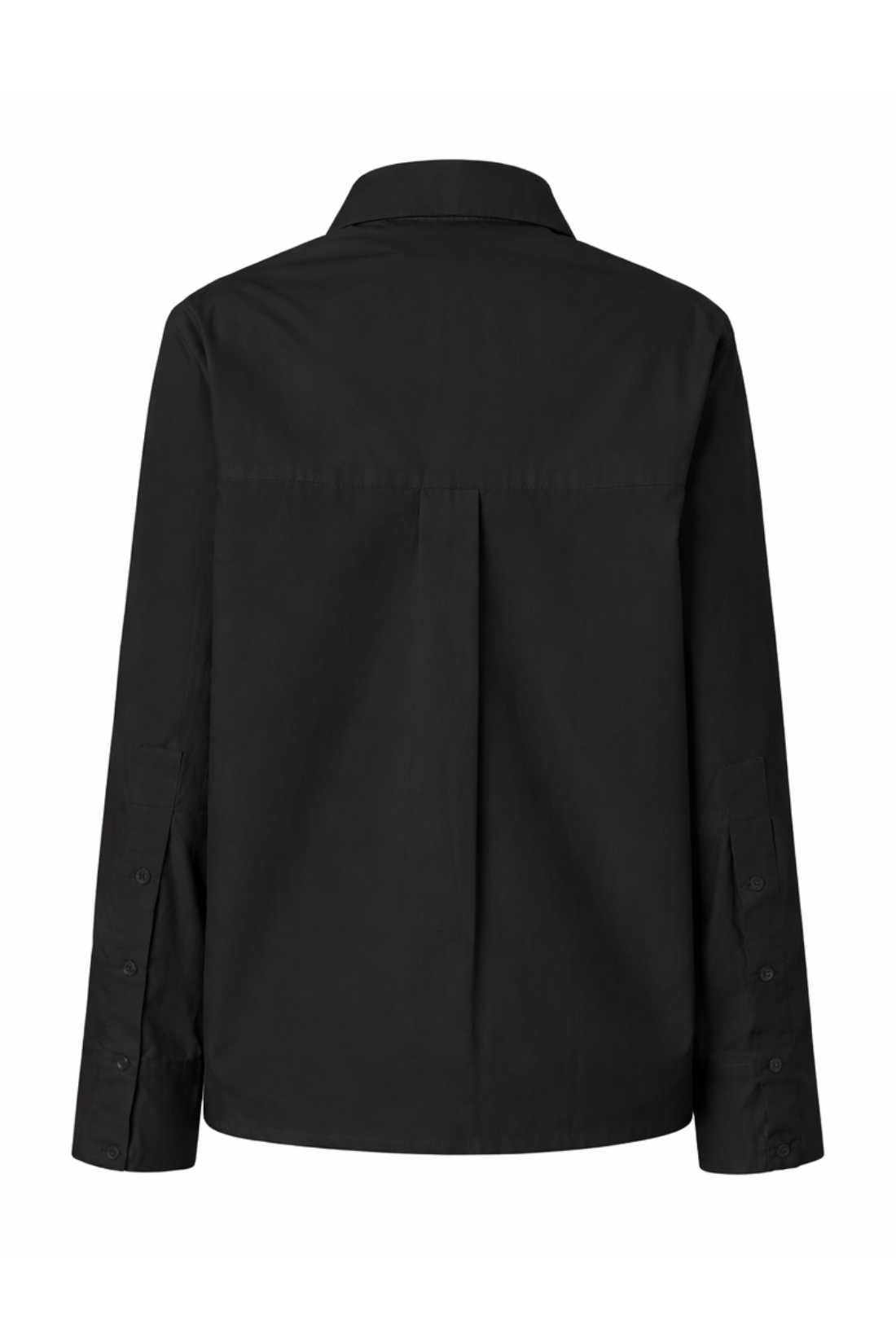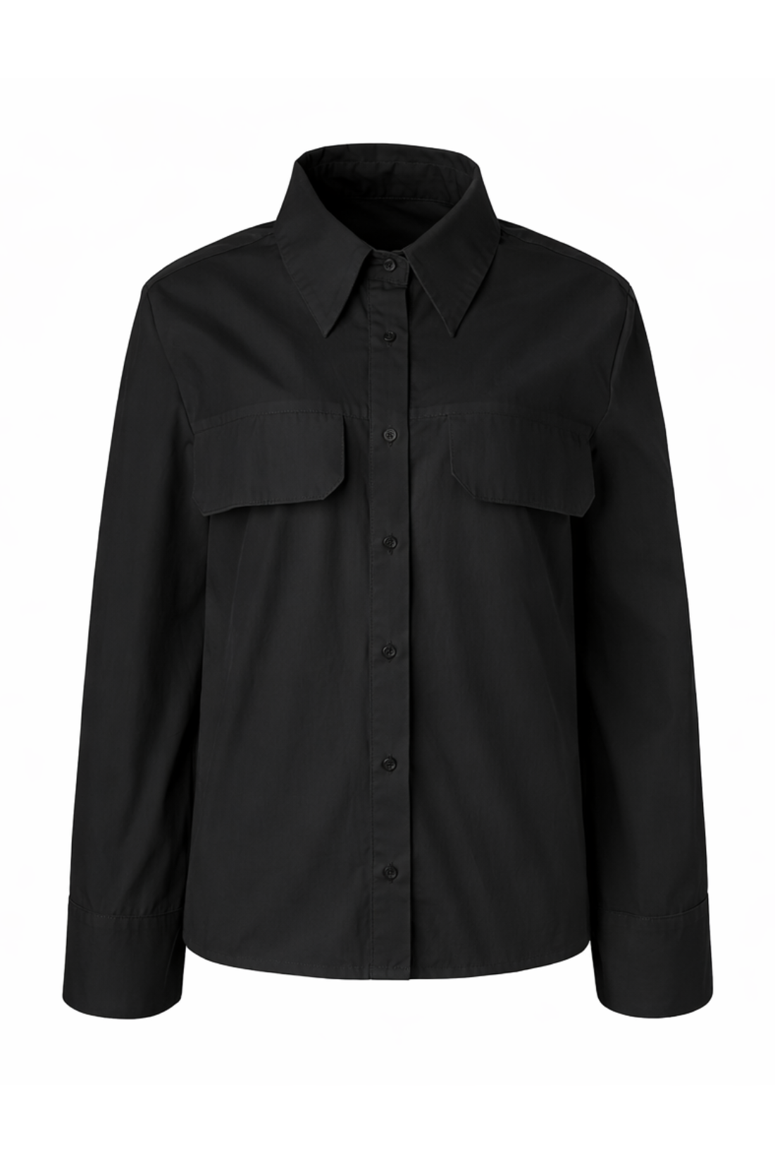 Camisa de algodão empapelado preto. Modelagem clássica de camisa, mangas retas com punho e botão. Bolsos grandes frontais. Fechamento frontal com botões pretos, prega nas costas.