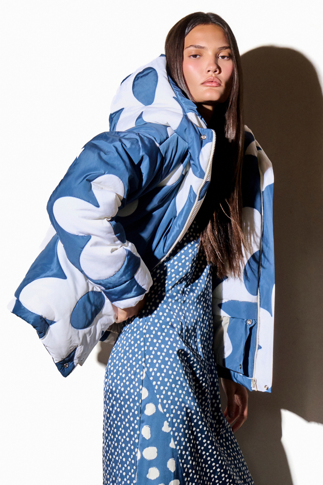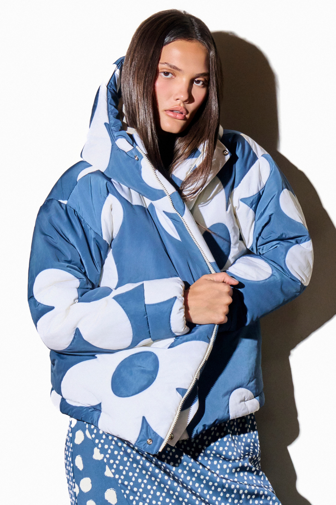 Jaqueta puffer de nylon impermeável com flores matelassadas a mão. Fechamento frontal com zíper grosso escondido por vista. Punho levemente franzido. Proteção térmica para baixas temperaturas. Forro de nylon. Capuz com recorte para encaixe. Nova cinta interna removível com elástico e botão para prática esportes de neve.