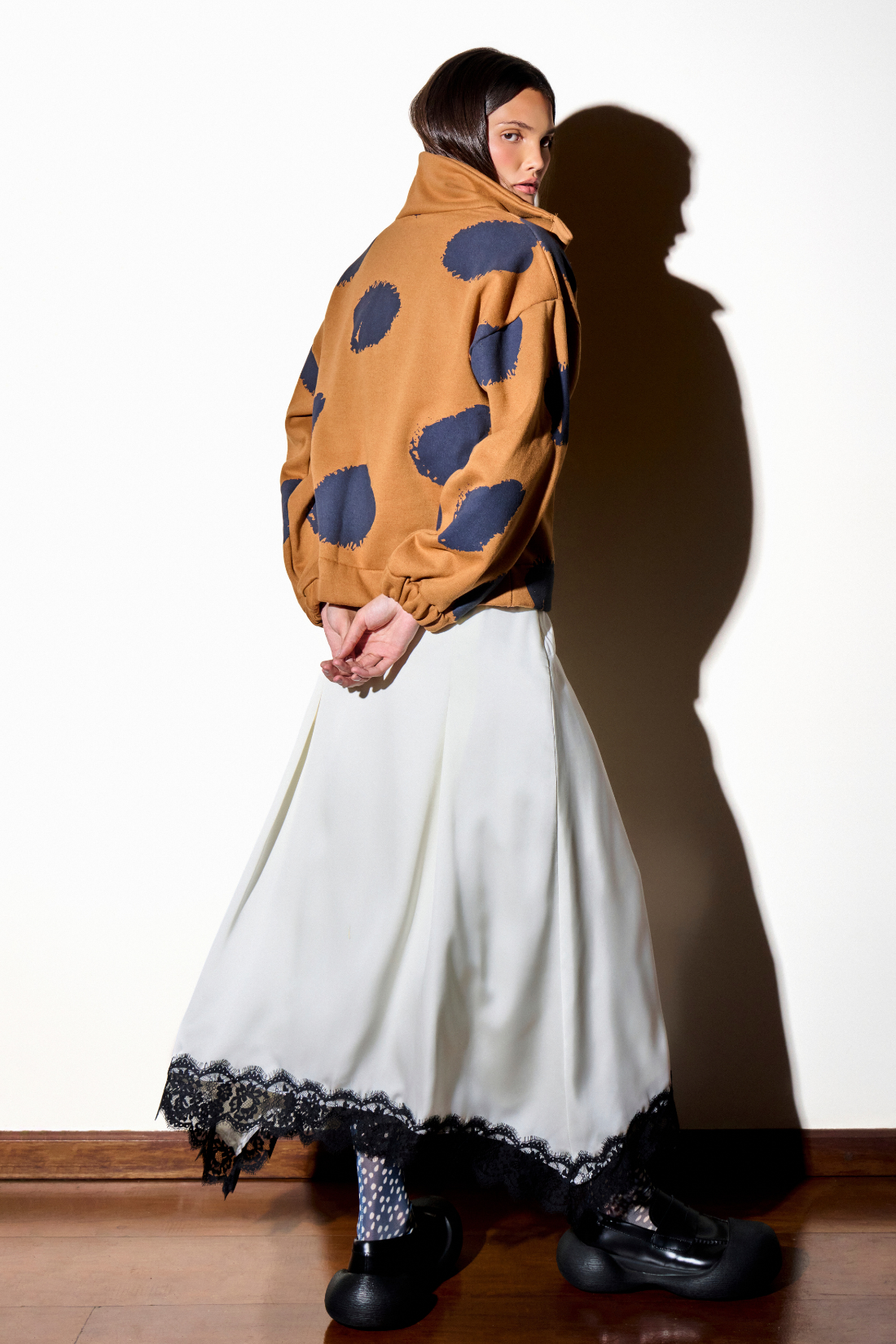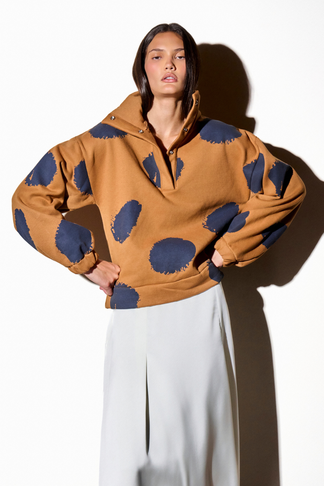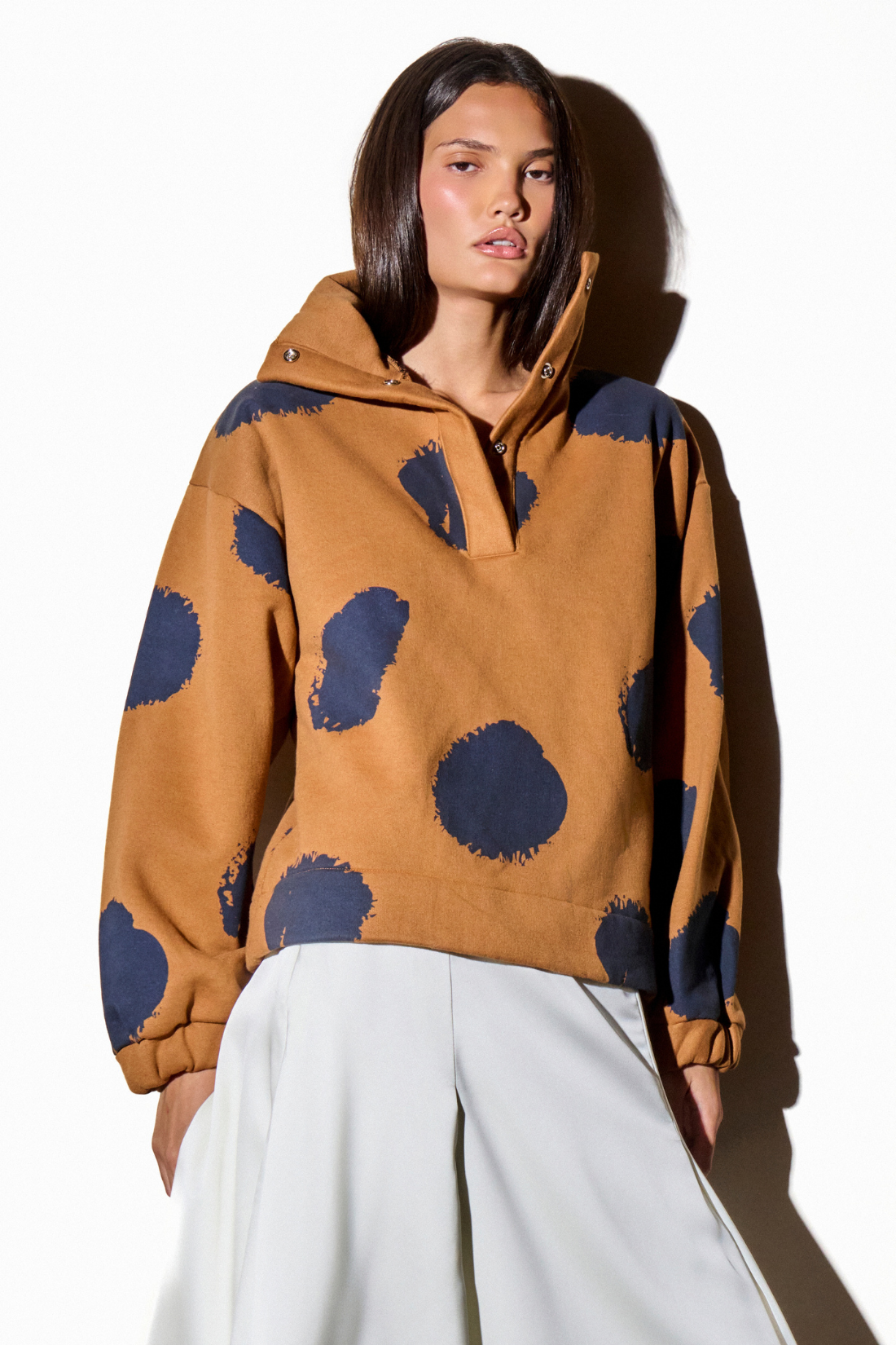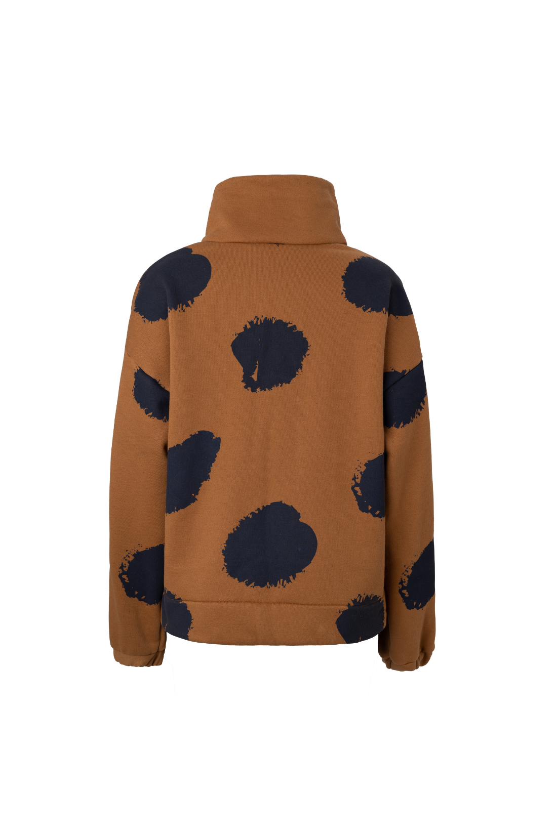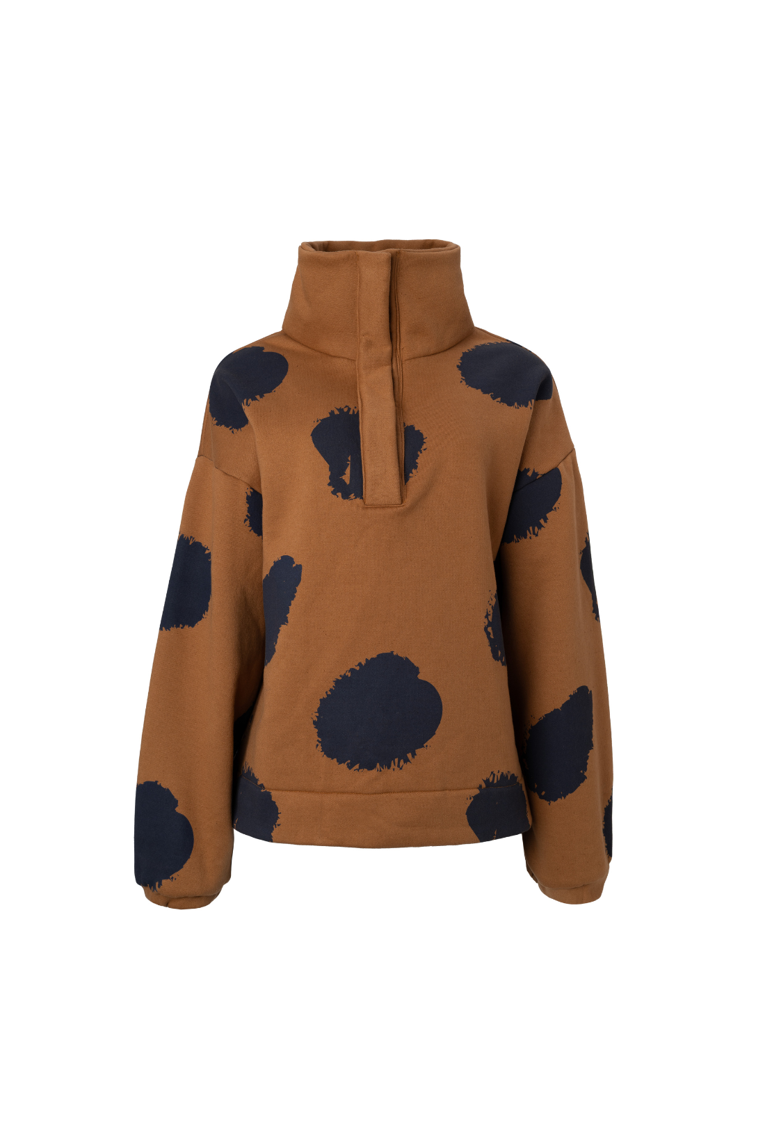 Moletom caramelo apeluciado por dentro com estampa de poá grande aplicada em silk na cor marinho. Gola alta com abertura e fechamento com botões metalizados de pressão. Modelagem reta no corpo e larga nas mangas. Punho de elástico.