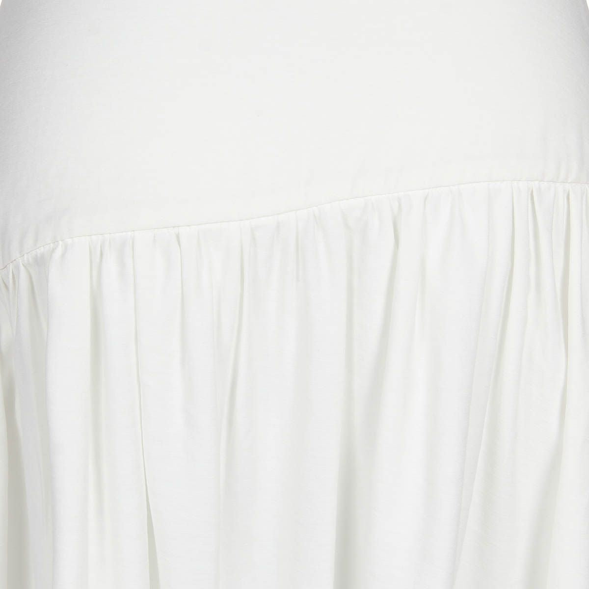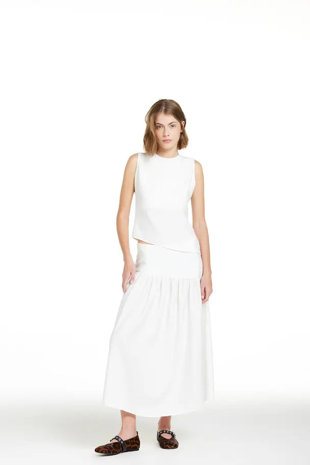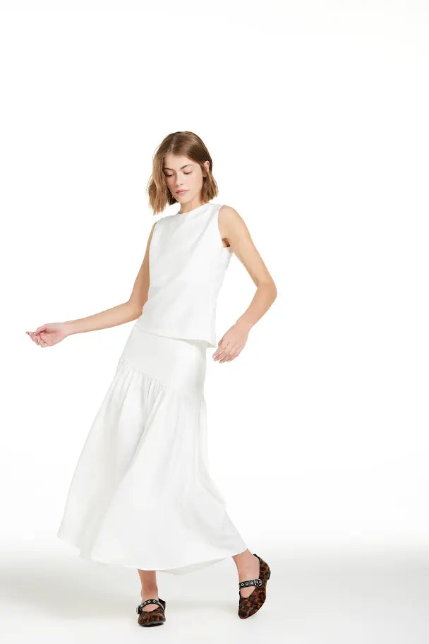 Saia midi off white, pala larga assimétrica, saia com pregas que dão leve volume, fechamento lateral de zíper invisível.