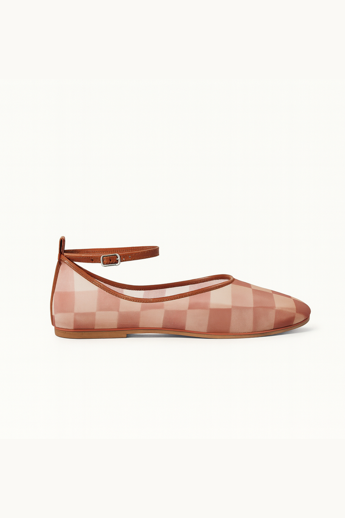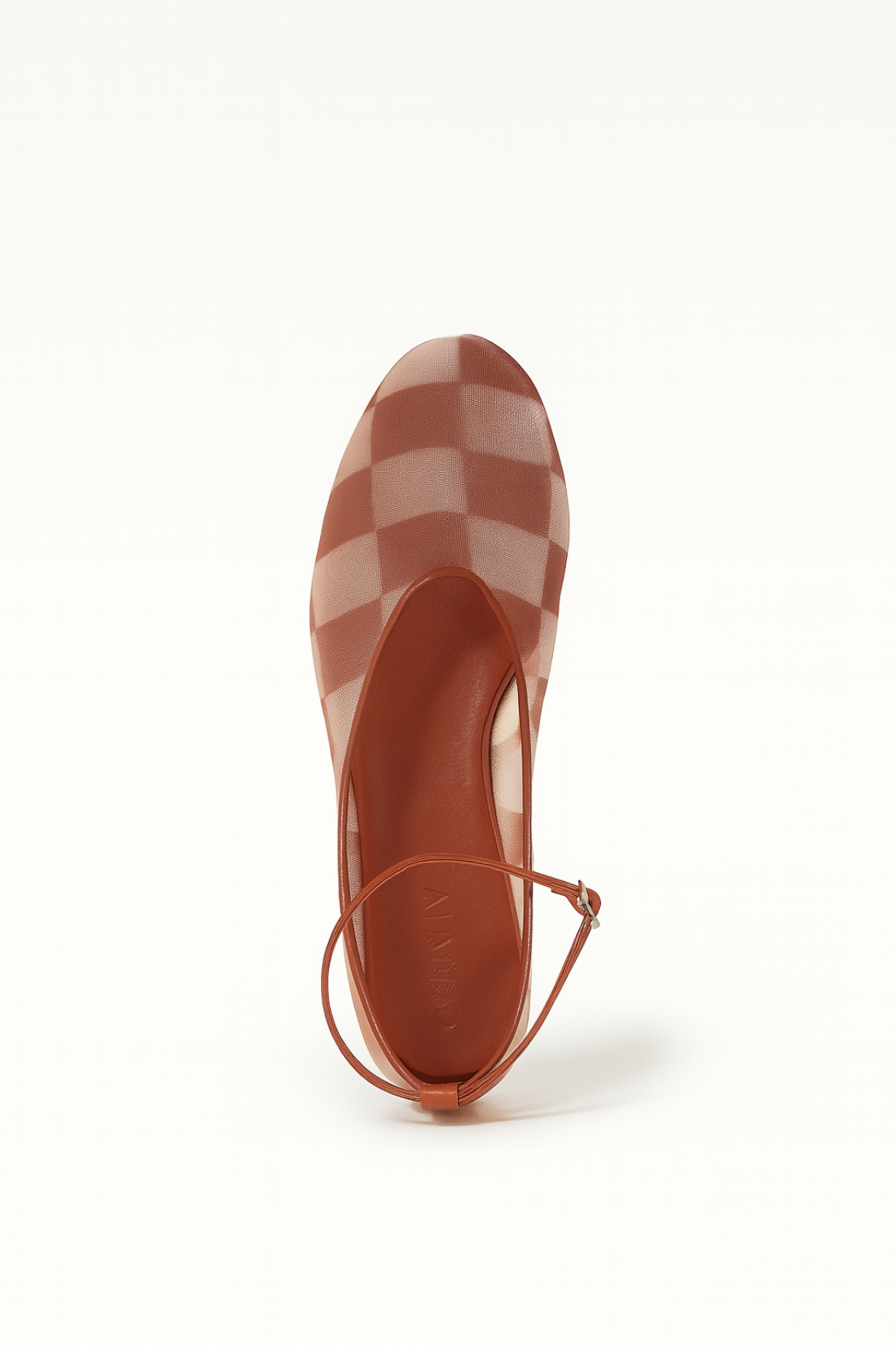 Sapatilha leve e moderna, produzida em tela translúcida com estampa quadriculada exclusiva GRAMA em tons de caramelo e creme. Acabamento em couro sintético caramelo, tira ajustável no tornozelo e sola baixa que garante conforto no dia a dia.